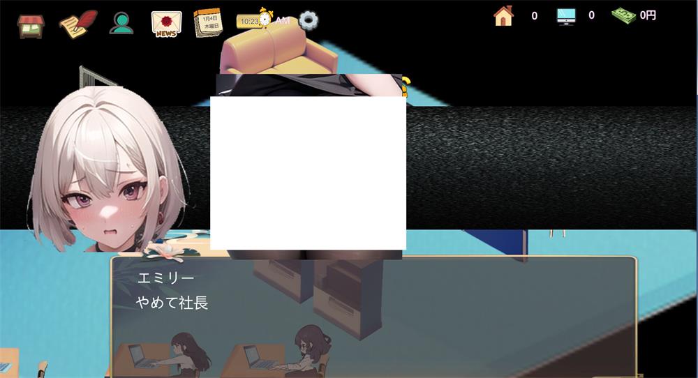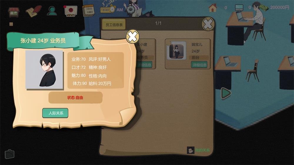 这是一款房产中介的模拟经营游戏。游戏通过键盘的方向键或鼠标左键来操作主角移动,通过空格键和场景交互。游戏中您将接手一个濒临倒闭的房产公司,努力招聘员工,在保证公司存活下去的同时,去攻略招聘来的各种美女吧!