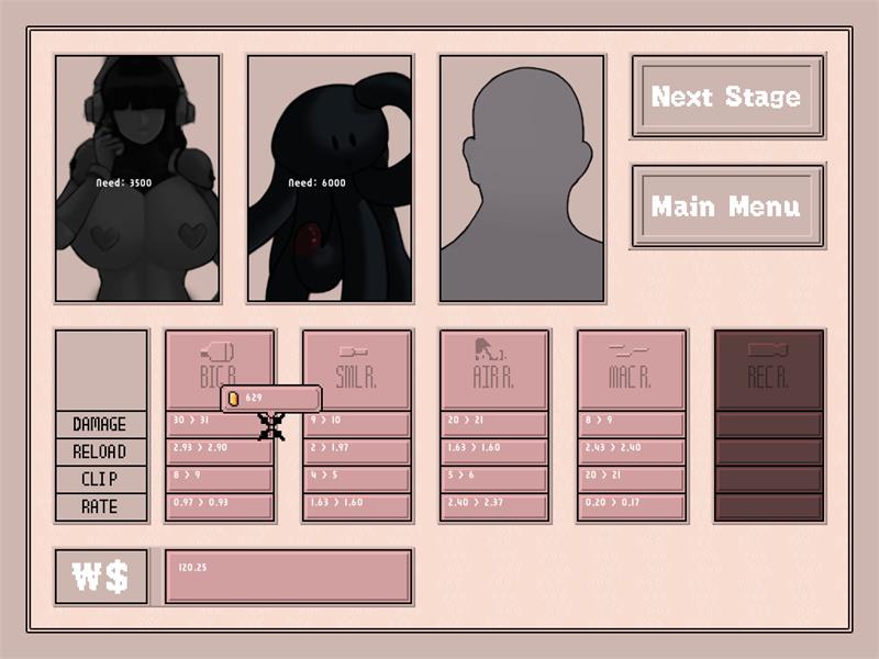 每关完成获得的金钱可以拿来升级枪械,一共有5种枪械,手枪,喷子,狙击枪,机枪,火箭筒。